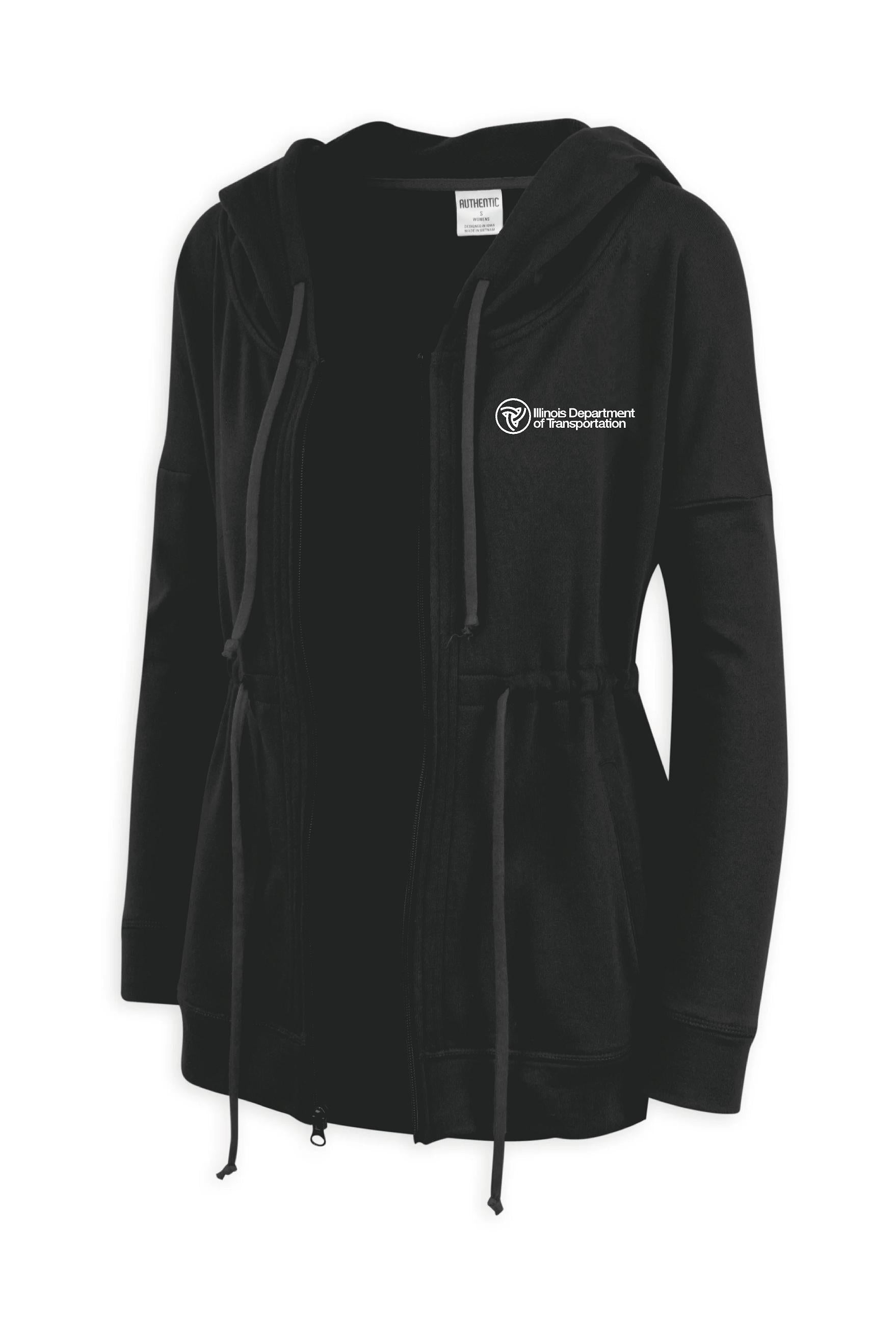 FEATURES: long sleeve hooded jacket, drop shoulders, drawstring at the waist, hip pockets, self-fabric cuffs and waistband, side slit at hem